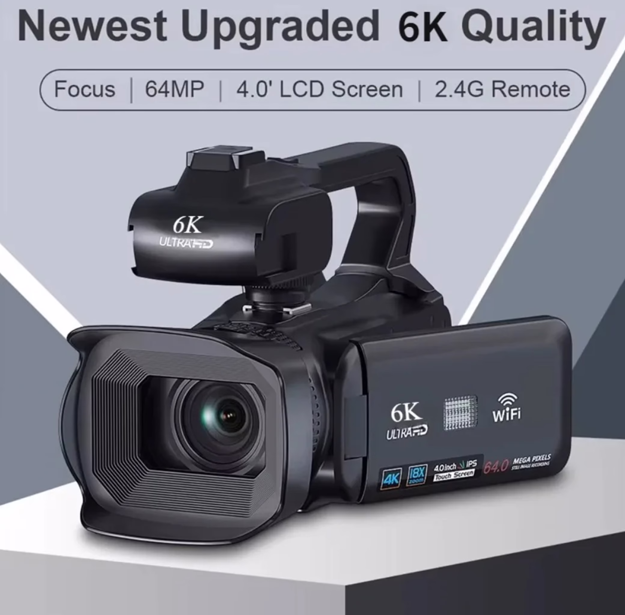 This 6K Professional Video Camera is a high‑performance 64MP digital camcorder designed for creators, vloggers, and content producers who demand sharp, cinematic-quality footage. It records stunning 6K resolution video, delivering exceptional detail and clarity that can be easily downscaled to 4K or 1080p for smooth playback on YouTube, social media, and live streaming platforms.