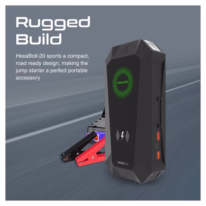 The Promate HexaBolt-20 is a versatile and powerful jump starter designed for automotive use, featuring a peak current of 1500A/12V. This jump starter is equipped with a 19200mAh power bank, allowing it to jump-start cars and motorcycles efficiently. The Promate HexaBolt-20 is your all-in-one charging solution, engineered to power up your entire tech arsenal with speed and safety. This compact powerhouse boasts multiple ports, allowing you to simultaneously charge smartphones, tablets, smartwatches, and more, eliminating the need for a cluttered mess of adapters.
