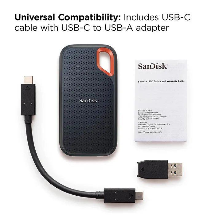 - SanDisk Extreme Portable USB 3.2 Gen 2 Type-C External SSD (Black) – USB-C to USB-C Cable – USB-C to USB-A Adapter – User Manual – SanDisk 5 Year Limited Warranty – Bundle Includes: – Slinger Portable Hard Drive Case