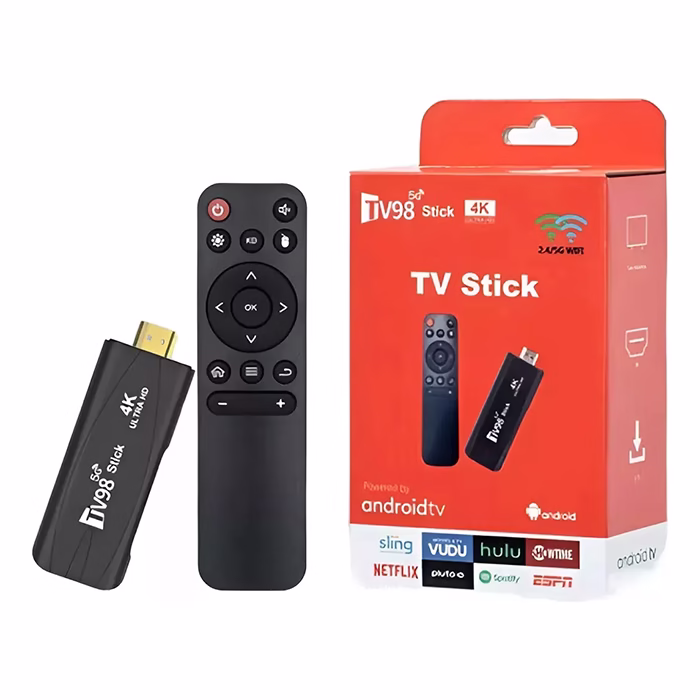 The TV98 Mini TV Stick is a compact Android TV stick available in various configurations, including options with 8GB and 128GB storage. It runs on Android 12 or Android 14 depending on the model, featuring an Allwinner H618 quad-core Cortex-A53 processor and Mali-G31 MP2 GPU. The device supports 4K UHD video output at 60fps and even up to 8K video playback in some versions, with HDMI 2.0a output. It includes dual-band Wi-Fi (2.4G/5G), Bluetooth 5.0, and comes with a remote control that supports voice commands via Google Assistant.